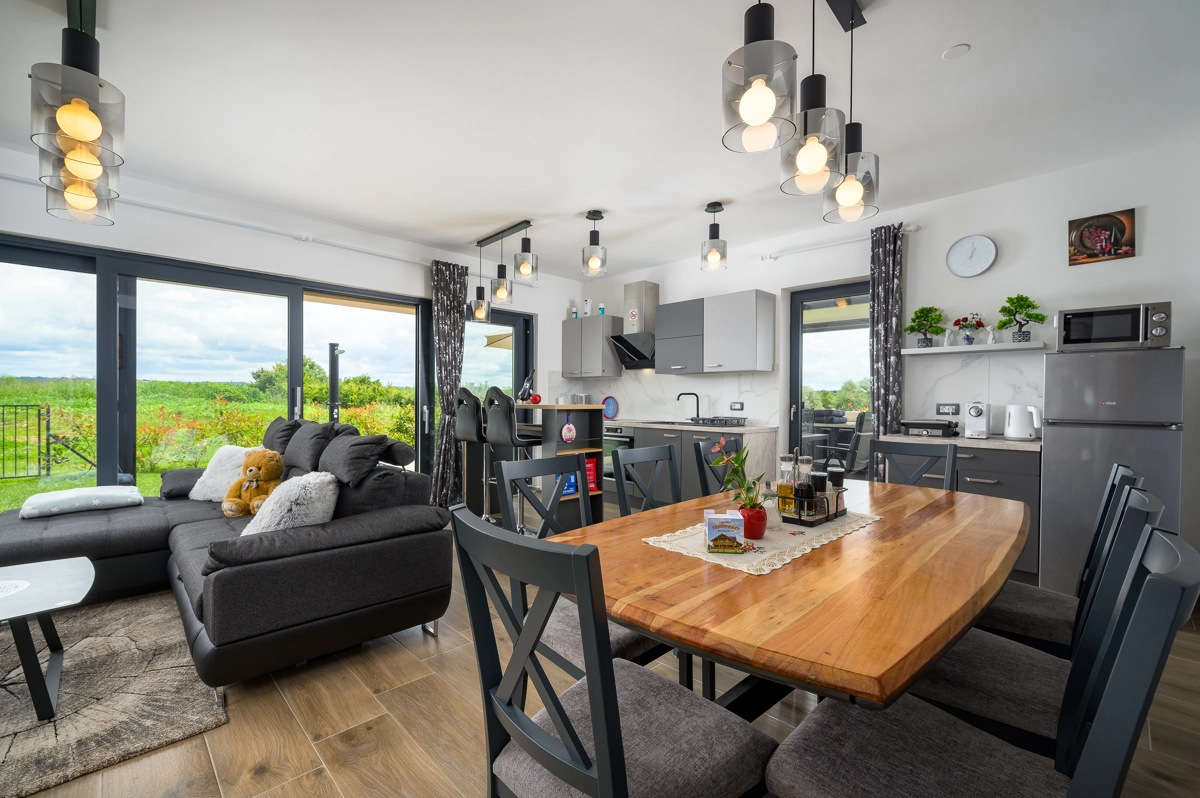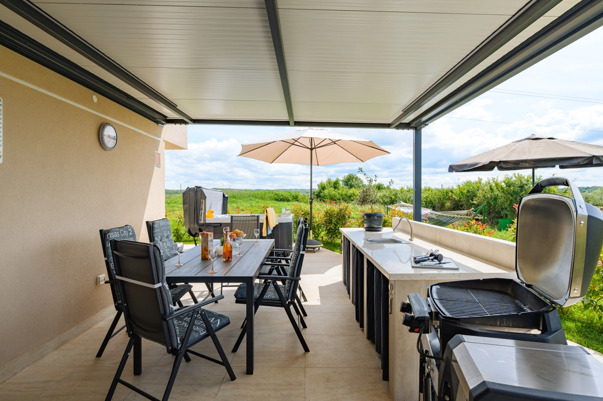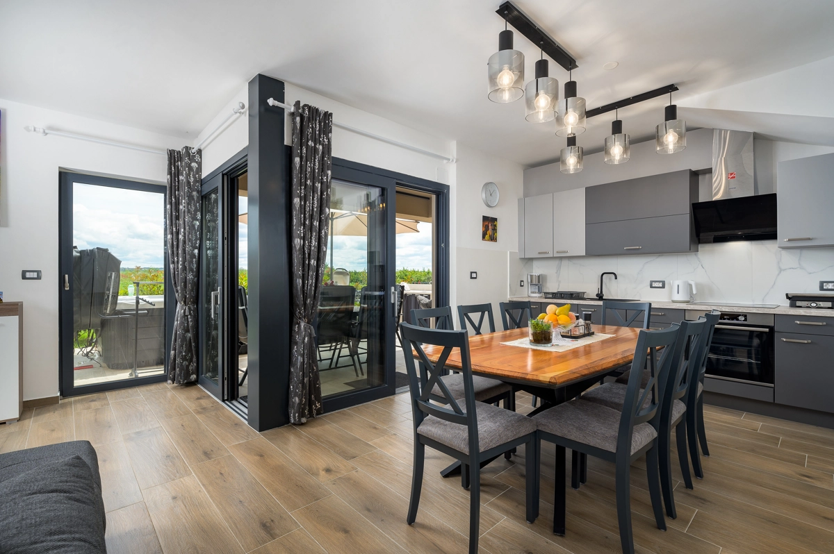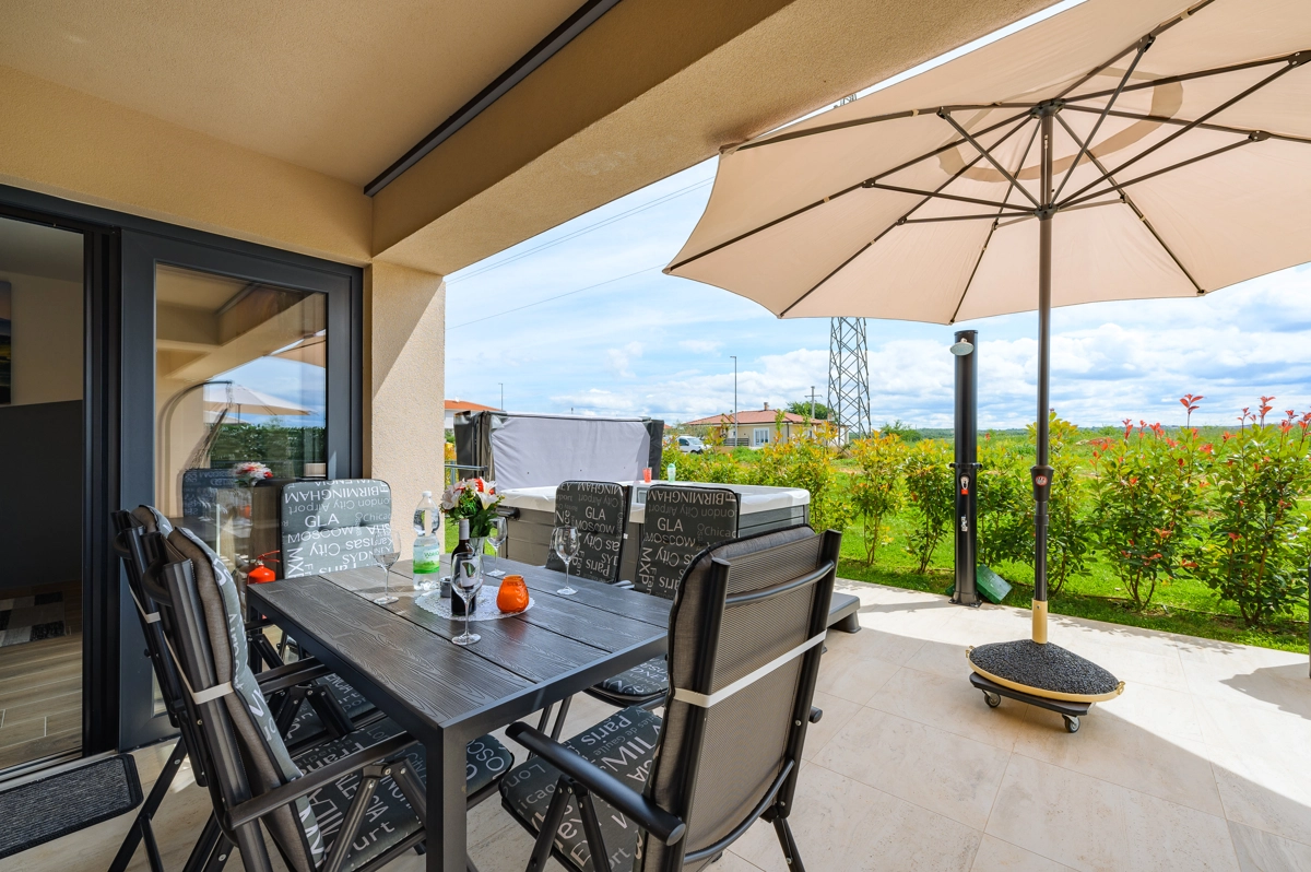 A newly built building with two large apartments, each with a private outside jacuzzi, outside kitchen with grill, terrace, garden and private parking. The apartments are carefuly furbished and equipped to give you a maximum comfort for your vacation. Located in a residential area at the end of Umag town, with a view at fields and meadows. The center of town and the beaches are easily reacheble by foot if you like a nice walk, or in just few minutes by car. Dislocated from the towns crowdedness and yet so close to all of the towns amenities.
