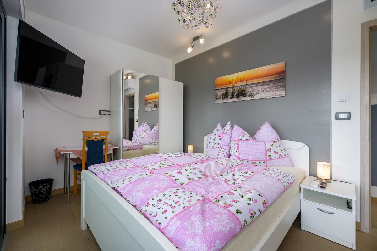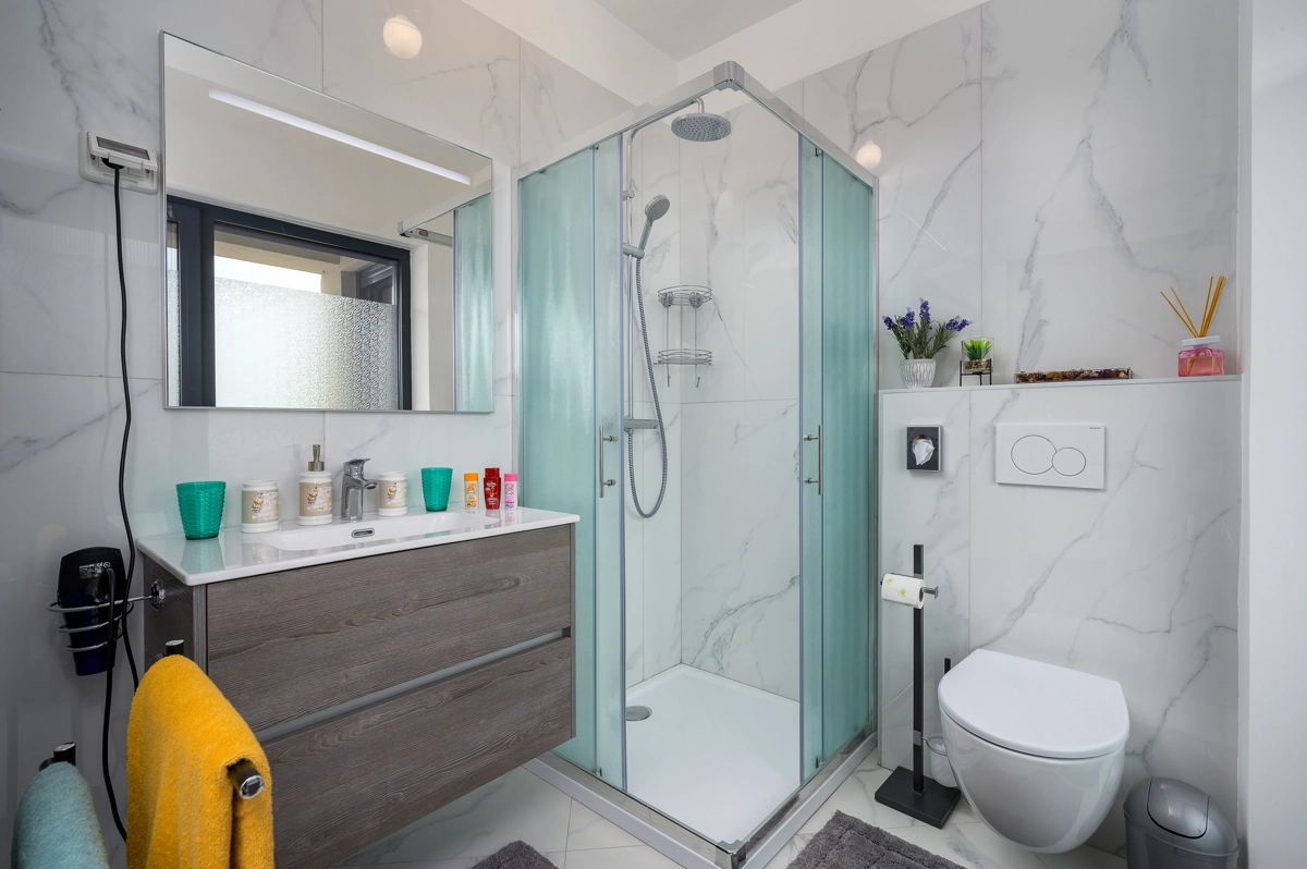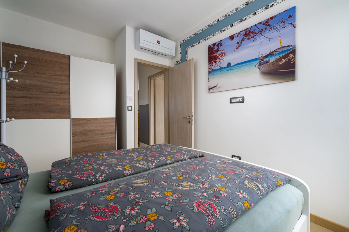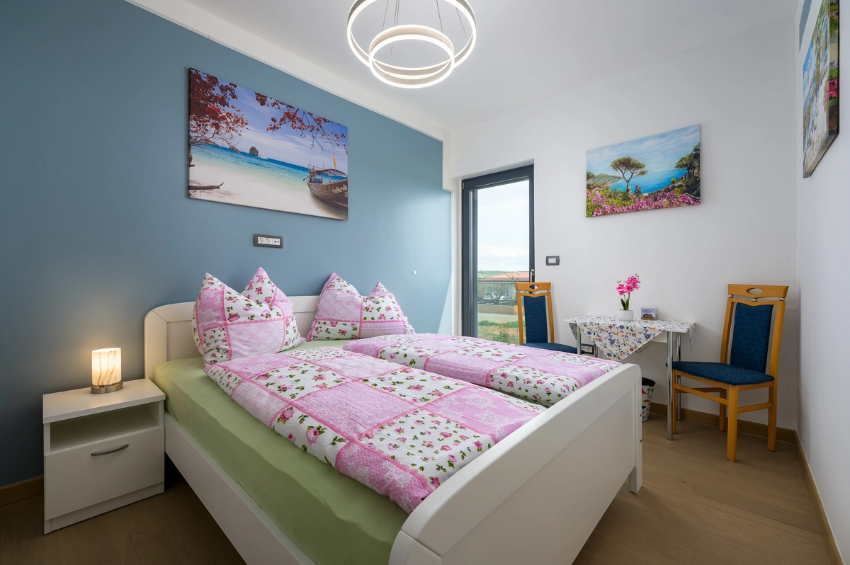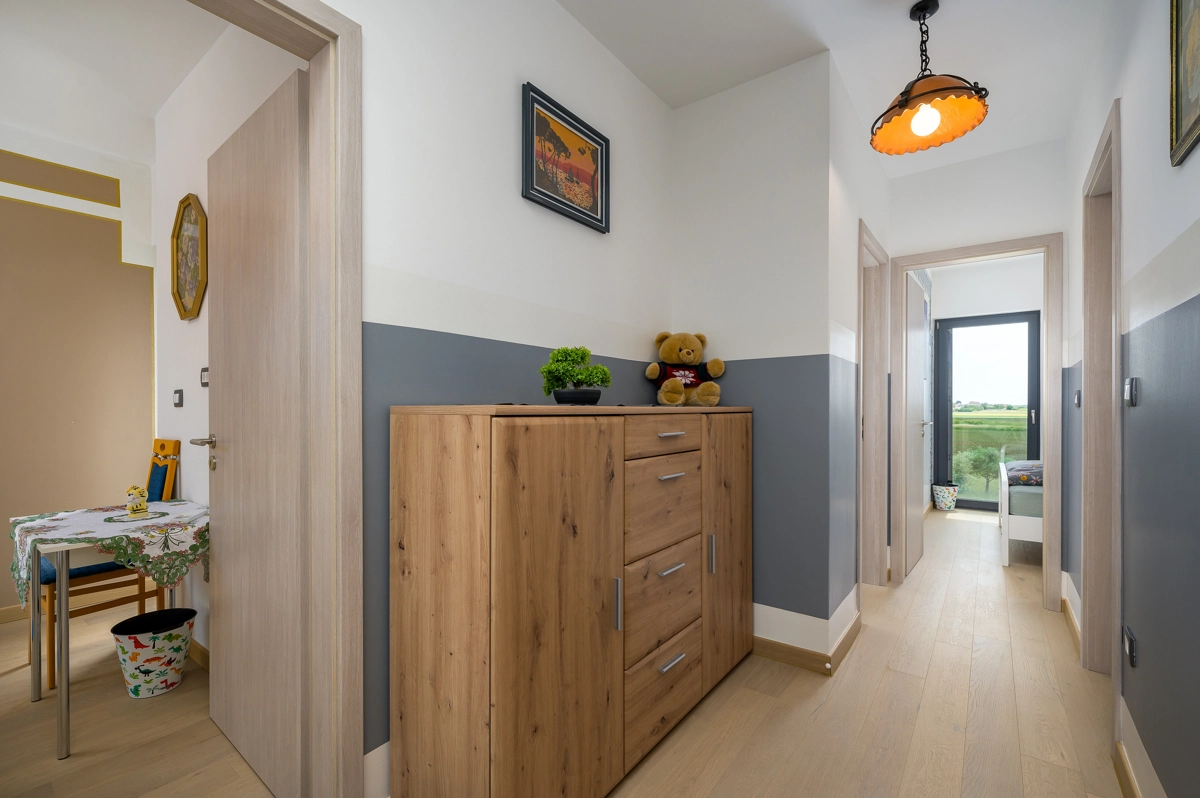 A newly built building with two large apartments, each with a private outside jacuzzi, outside kitchen with grill, terrace, garden and private parking. The apartments are carefuly furbished and equipped to give you a maximum comfort for your vacation. Located in a residential area at the end of Umag town, with a view at fields and meadows. The center of town and the beaches are easily reacheble by foot if you like a nice walk, or in just few minutes by car. Dislocated from the towns crowdedness and yet so close to all of the towns amenities.