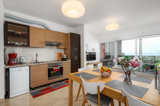 Ovaj prostrani dvosobni stan nalazi se na odličnoj lokaciji u blizini mora, sa prekrasnim pogledom na more i staru gradsku jezgru. Po ulasku u stan dočekuje vas predsoblje dobrodošlice koje vodi do prostranog i otvorenog dnevnog boravka koji uključuje udoban prostor za sjedenje, blagovaonicu i kuhinju. Veliki prozori omogućuju prirodnom svjetlu da preplavi prostoriju i nude prekrasan pogled na more.