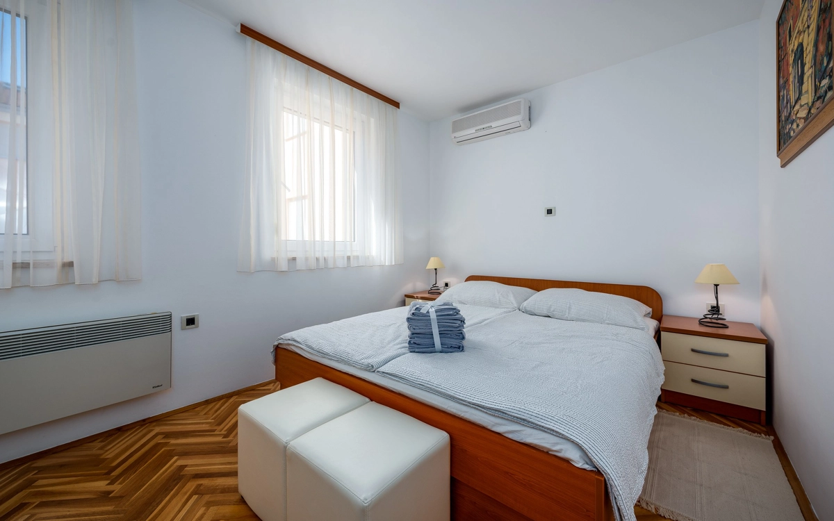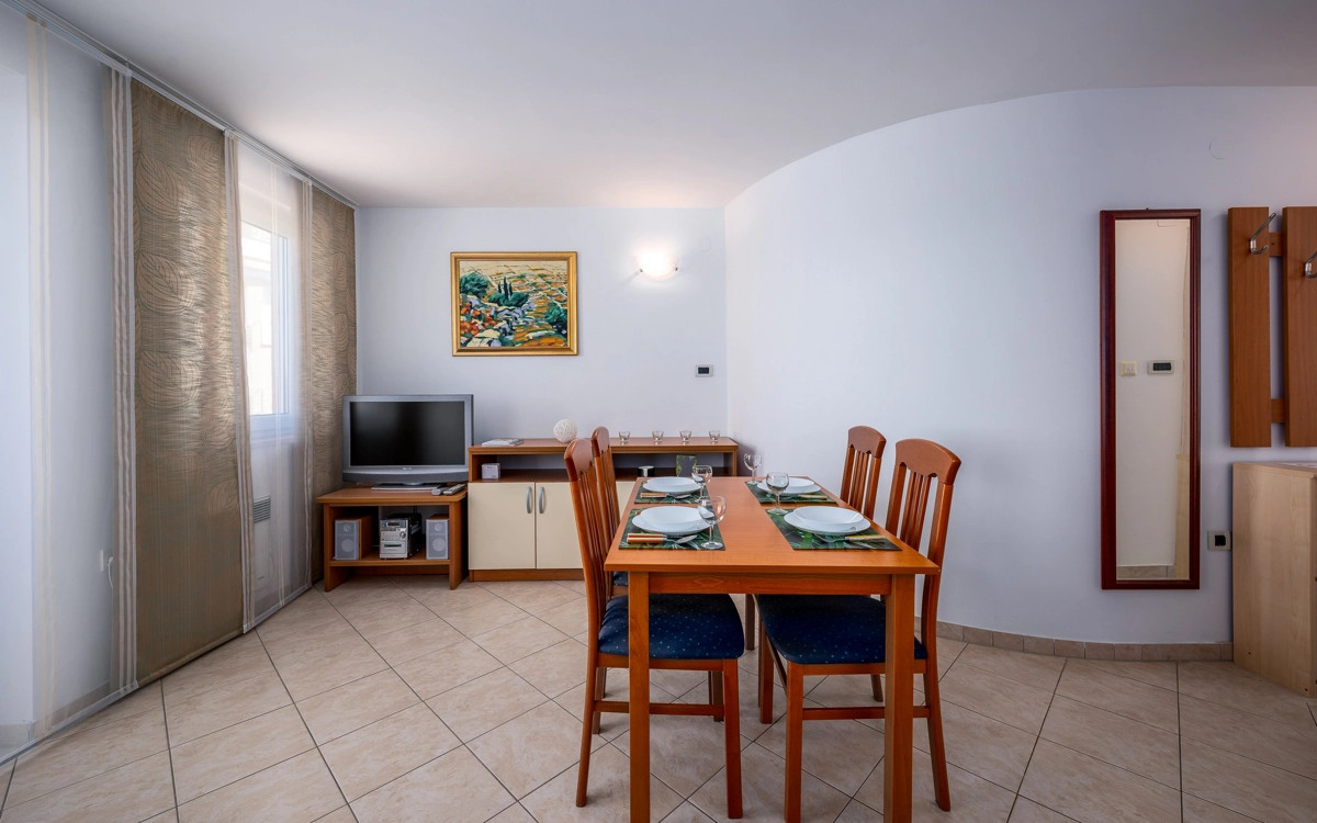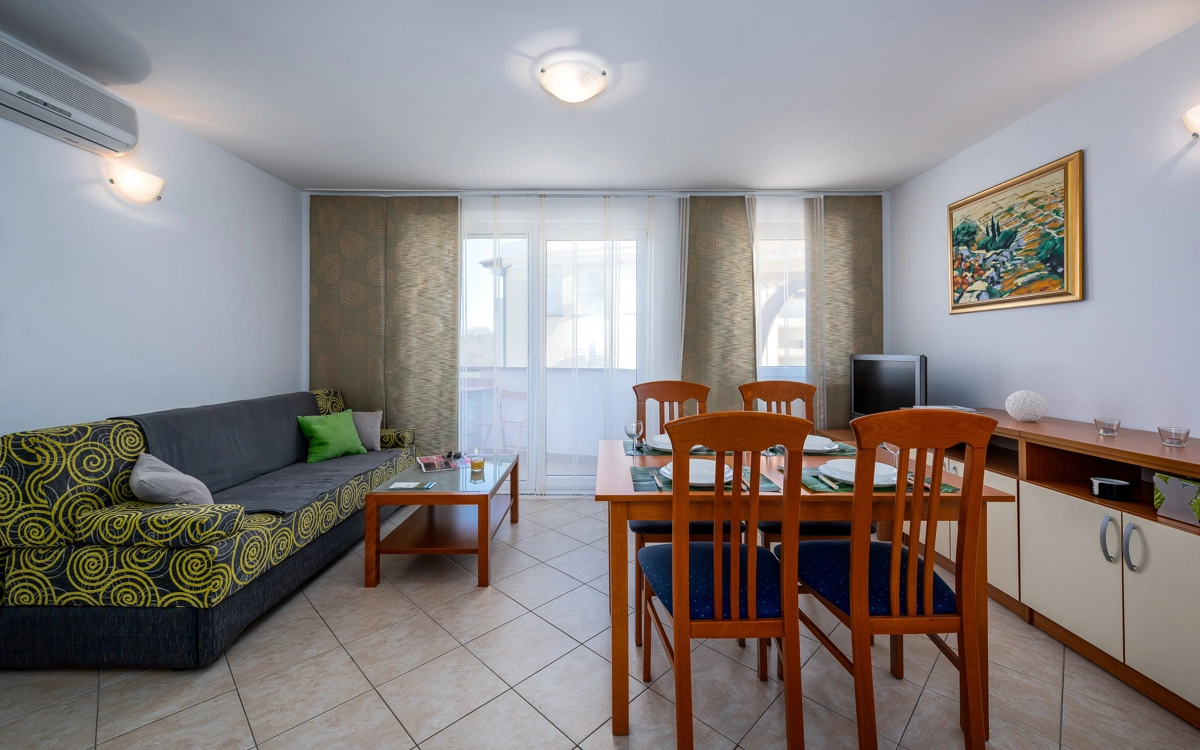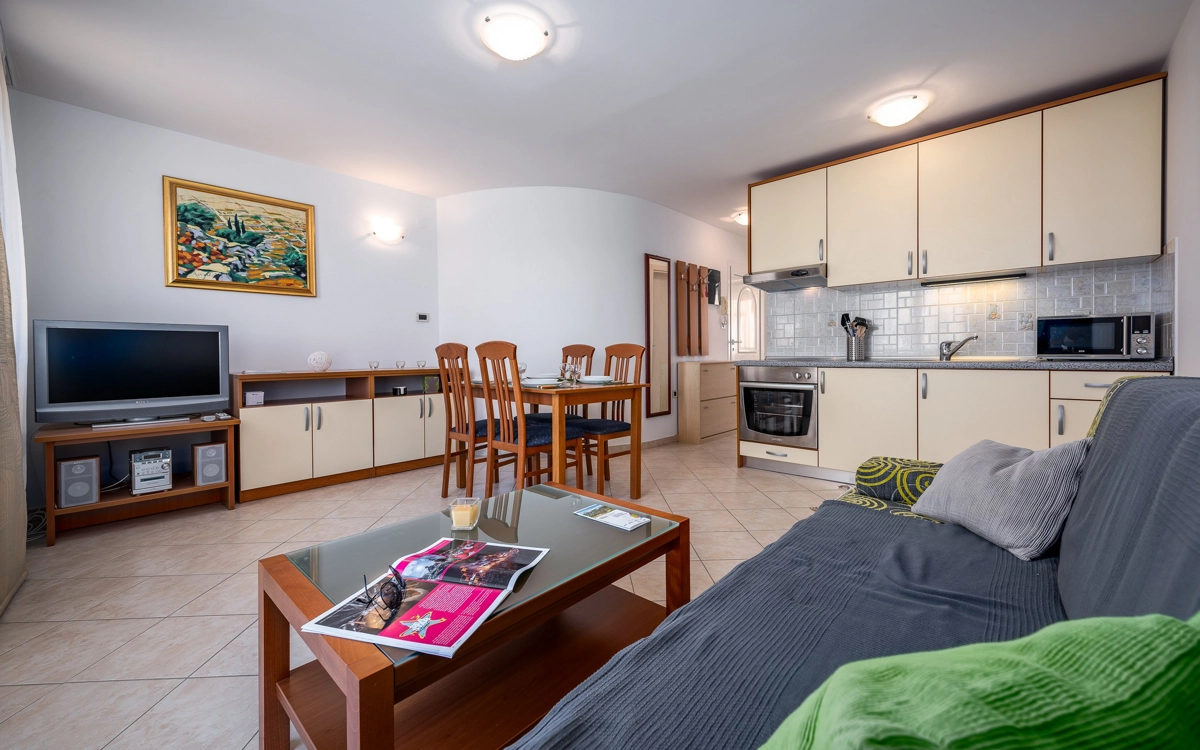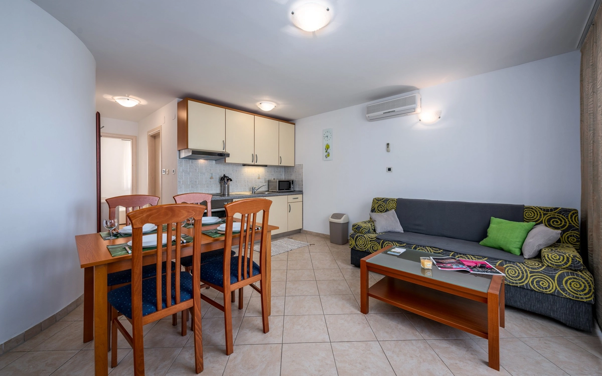 Ovaj apartman ima jednu dvokrevetnu sobu i dodatni kauč na razvlačenje za dvije osobe u dnevnoj sobi, što ga čini savršenim izborom za do 4 gosta. Apartman je opremljen kuhinjom, a ako ne planirate izlaziti navečer, preporučujemo da uživate u roštilju i druženju u vrtu. Ako ipak planirate izlazak, mogućnosti su brojne - mnoštvo aktivnosti u resortu Stella Maris, osvježenje na plaži, posjet teniskim terenima... sve unutar pet minuta hoda!