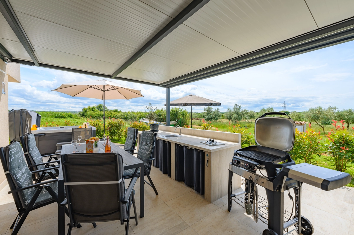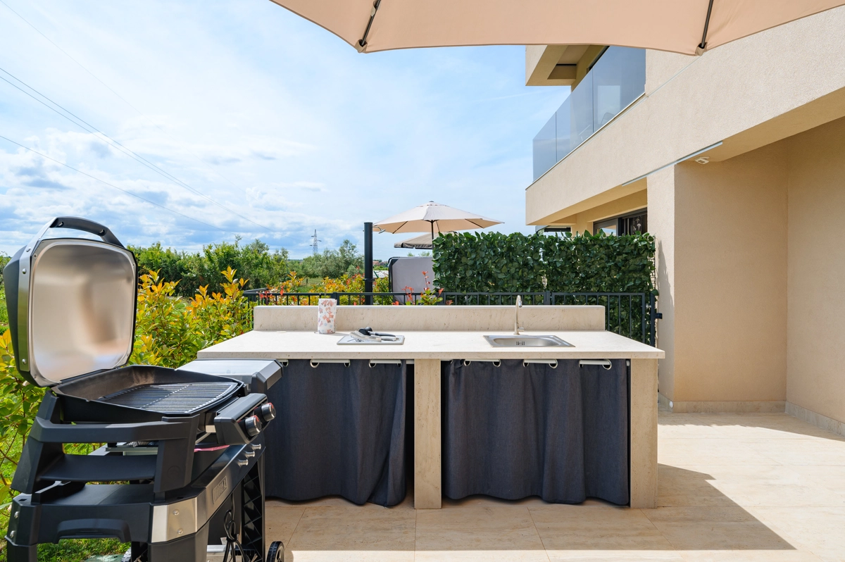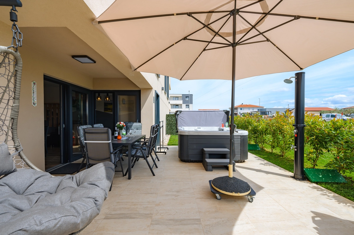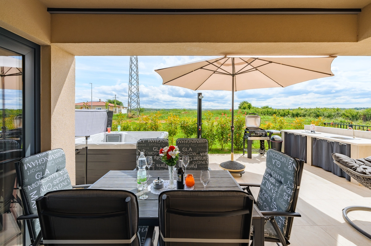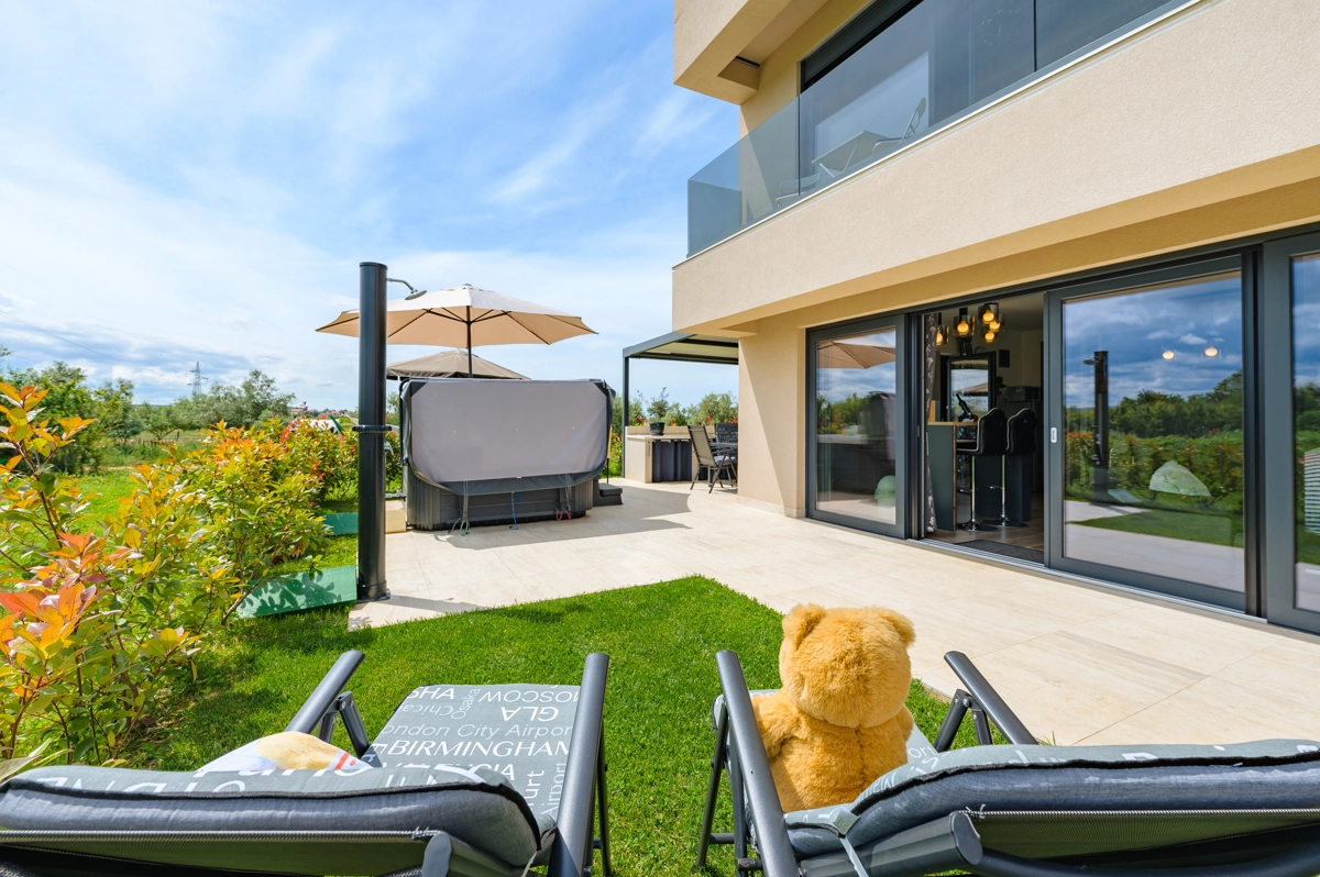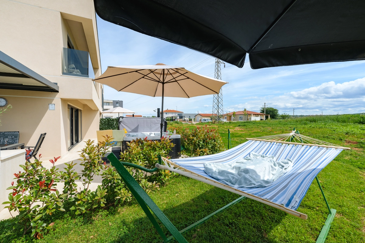 Novoizgrađena zgrada s dva velika apartmana, svaki s vlastitim vanjskim whirlpoolom, vanjskom kuhinjom s roštiljem, terasom, vrtom i privatnim parkingom. Apartmani su pažljivo uređeni i opremljeni kako bi Vam pružili maksimalnu udobnost za Vaš odmor. Nalazi se u rezidencijalnoj četvrti na kraju grada Umaga, s pogledom na polja i livade. Središte mjesta i plaže lako su dostupni pješice ako volite laganu šetnju ili za samo nekoliko minuta vožnje automobilom. Izdvojeno od gradske gužve, a opet tako blizu svih gradskih sadržaja.
