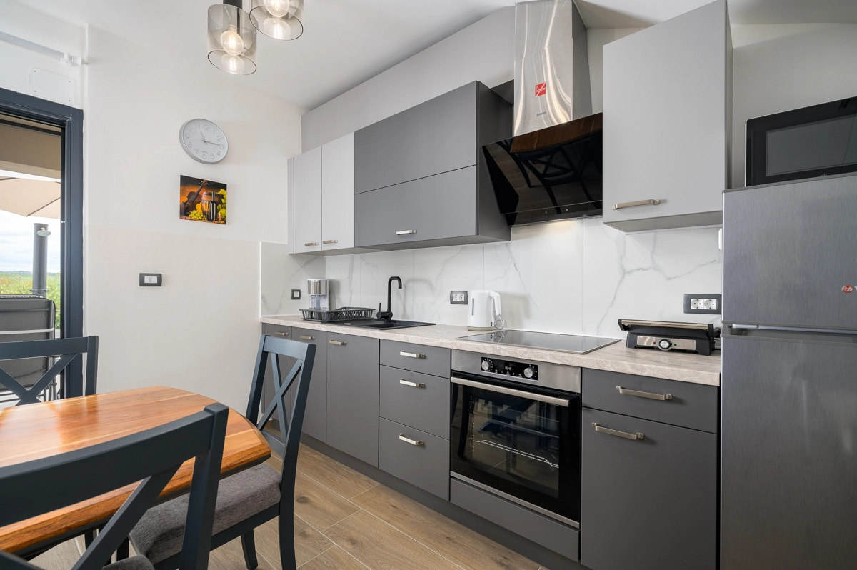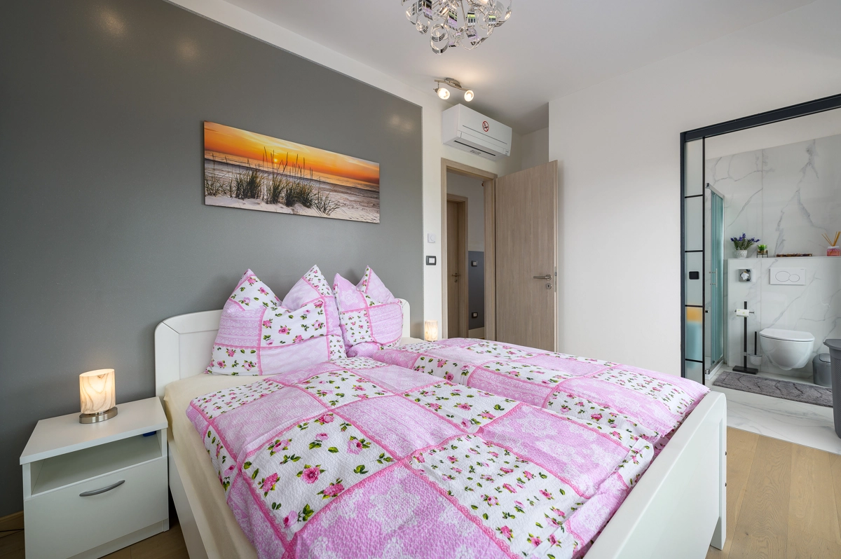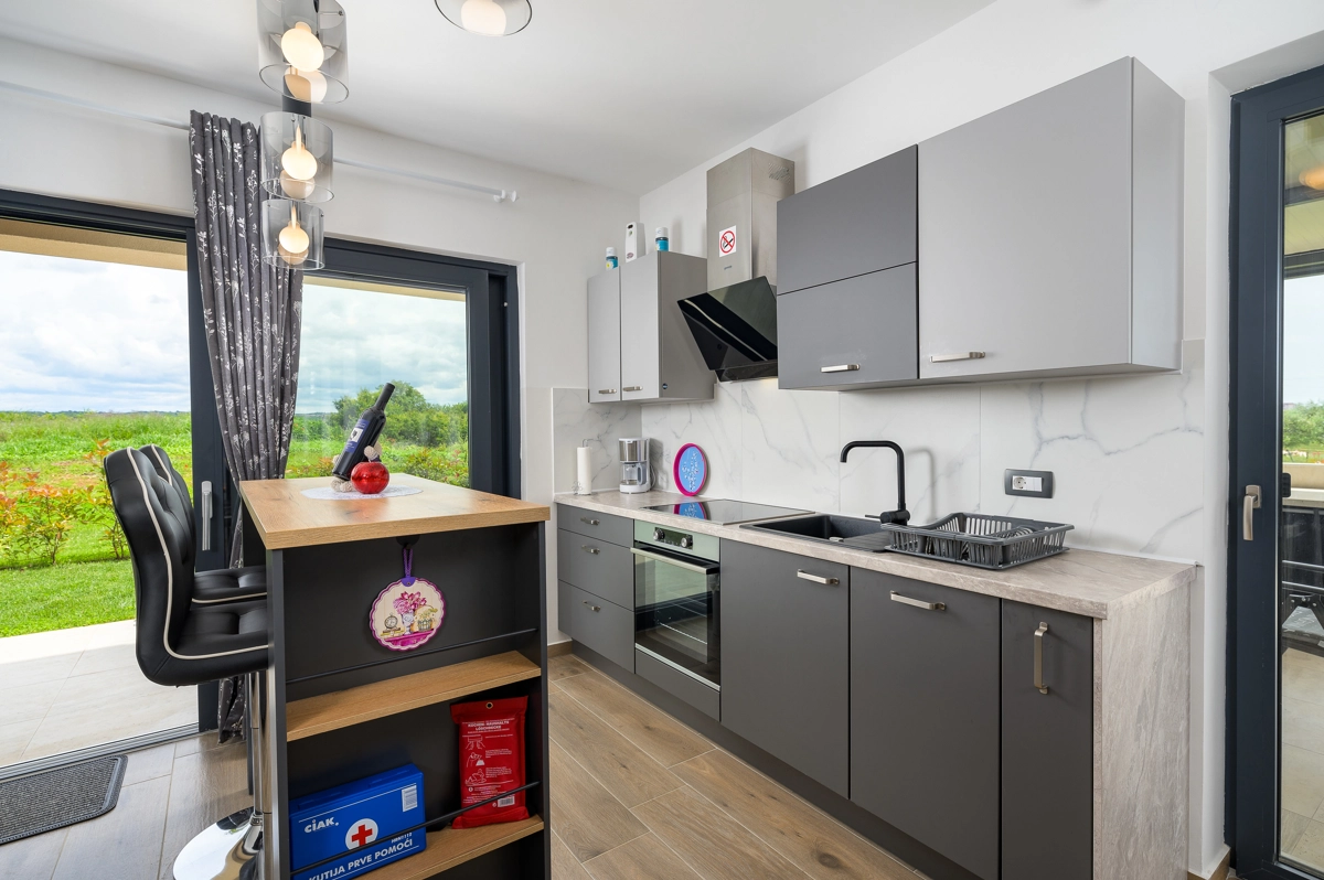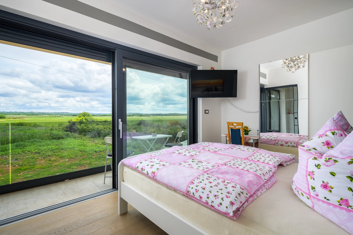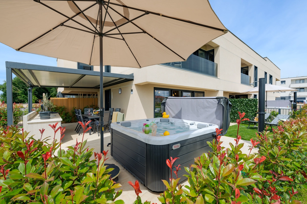 Novoizgrađena zgrada s dva velika apartmana, svaki s vlastitim vanjskim whirlpoolom, vanjskom kuhinjom s roštiljem, terasom, vrtom i privatnim parkingom. Apartmani su pažljivo uređeni i opremljeni kako bi Vam pružili maksimalnu udobnost za Vaš odmor. Nalazi se u rezidencijalnoj četvrti na kraju grada Umaga, s pogledom na polja i livade. Središte mjesta i plaže lako su dostupni pješice ako volite laganu šetnju ili za samo nekoliko minuta vožnje automobilom. Izdvojeno od gradske gužve, a opet tako blizu svih gradskih sadržaja.