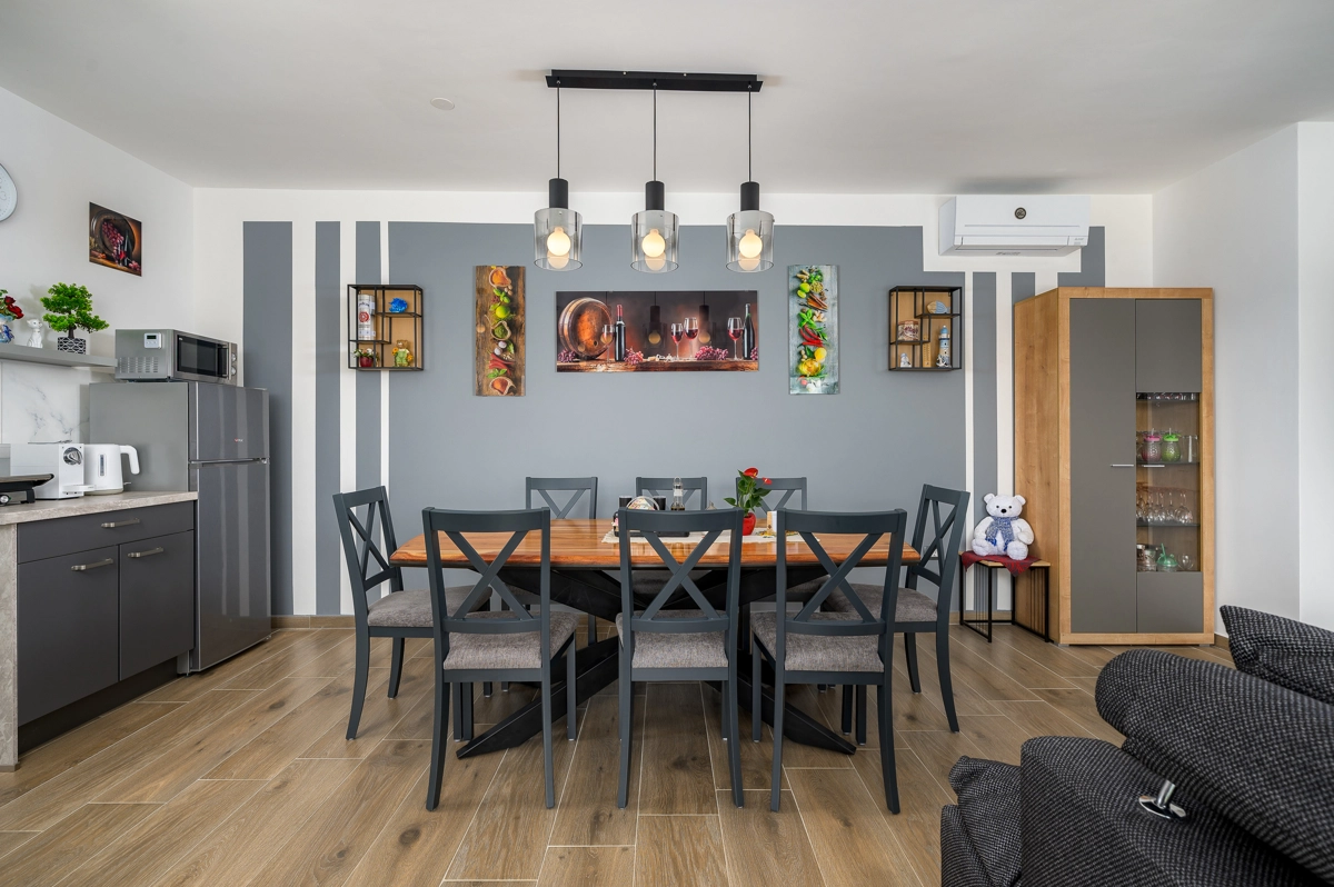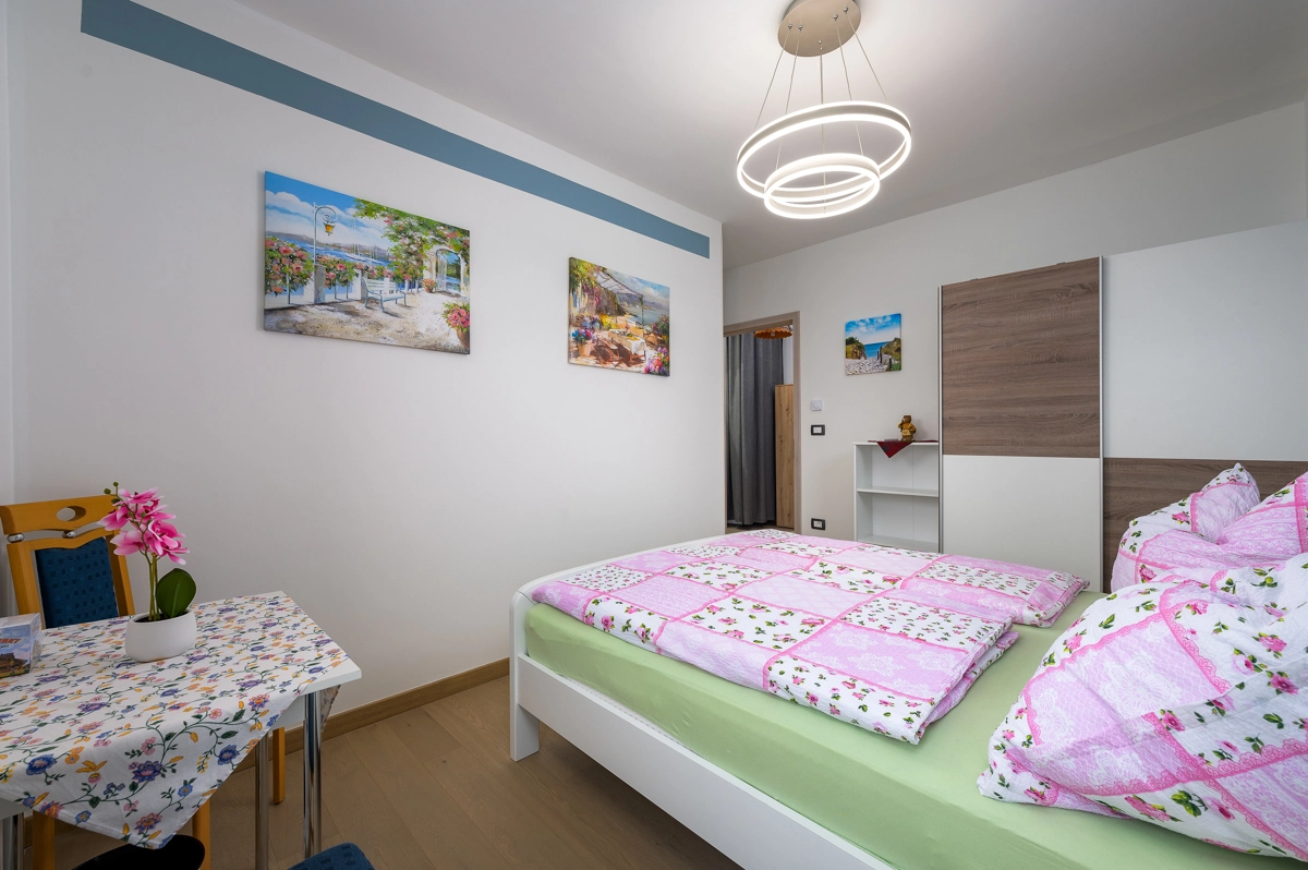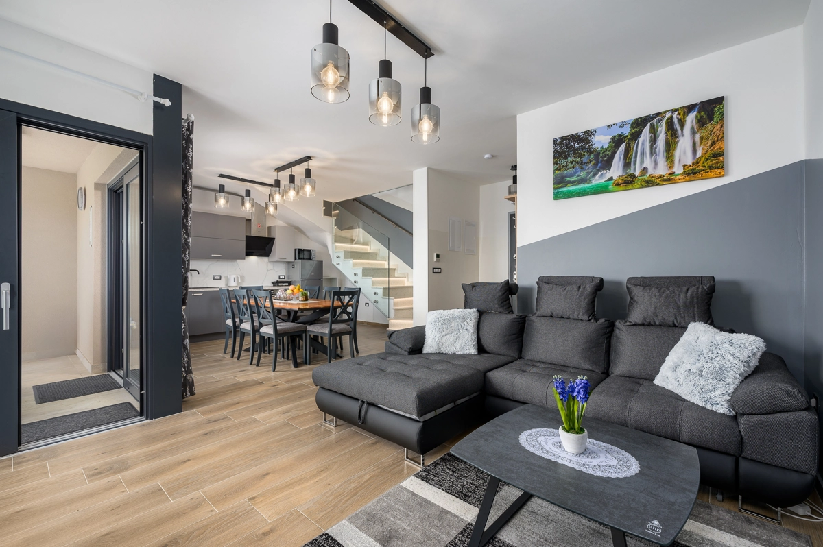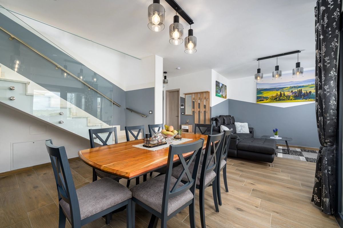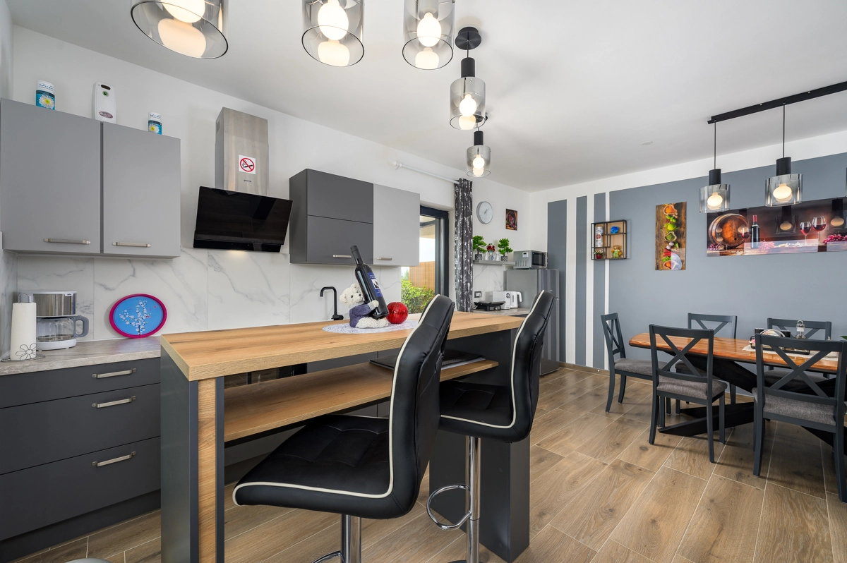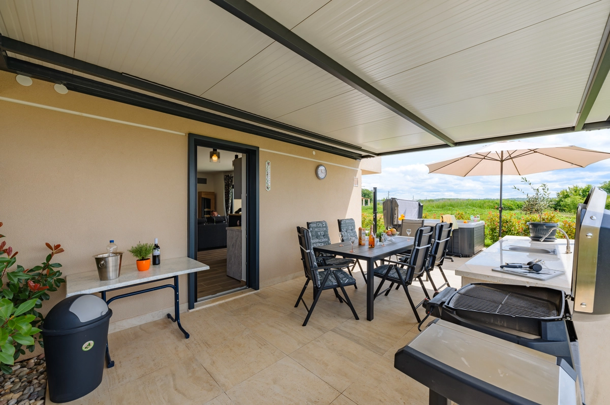 Novoizgrađena zgrada s dva velika apartmana, svaki s vlastitim vanjskim whirlpoolom, vanjskom kuhinjom s roštiljem, terasom, vrtom i privatnim parkingom. Apartmani su pažljivo uređeni i opremljeni kako bi Vam pružili maksimalnu udobnost za Vaš odmor. Nalazi se u rezidencijalnoj četvrti na kraju grada Umaga, s pogledom na polja i livade. Središte mjesta i plaže lako su dostupni pješice ako volite laganu šetnju ili za samo nekoliko minuta vožnje automobilom. Izdvojeno od gradske gužve, a opet tako blizu svih gradskih sadržaja.