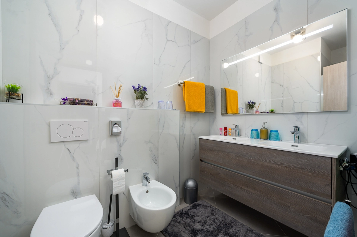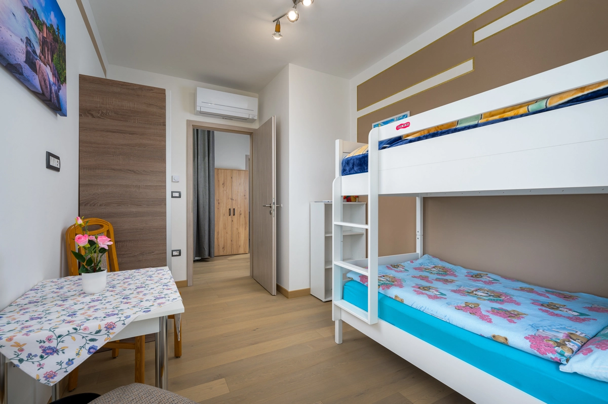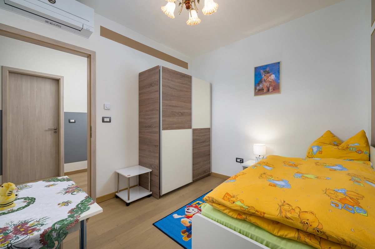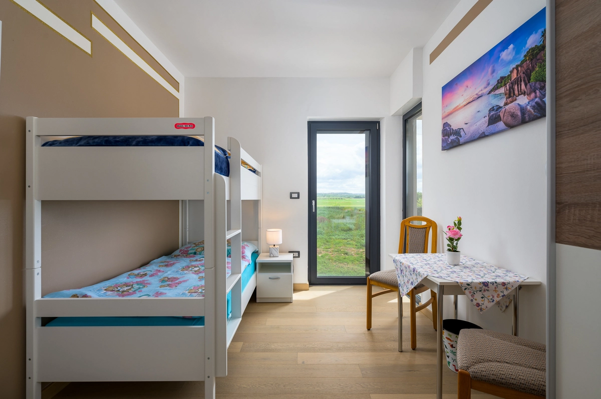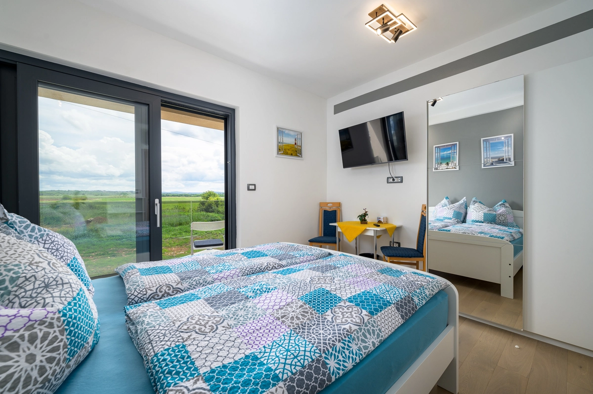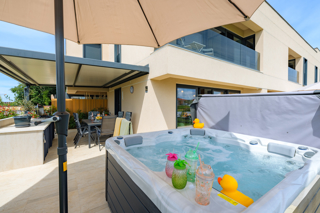 Un edificio moderno di nuova costruzione con due grandi appartamenti, ognuno con una vasca idromassaggio esterna privata, cucina esterna con grill, terrazza, giardino e parcheggio privato. Gli appartamenti sono arredati con cura e attrezzati per offrirti il massimo comfort per la tua vacanza. Situati in una zona residenziale alla fine della città di Umago, con vista su campi e prati. Il centro della città e le spiagge sono facilmente raggiungibili a piedi se ti piace una bella passeggiata, o in pochi minuti di auto. Dislocati dalla confusione della città e tuttavia così vicini a tutti i servizi della città.